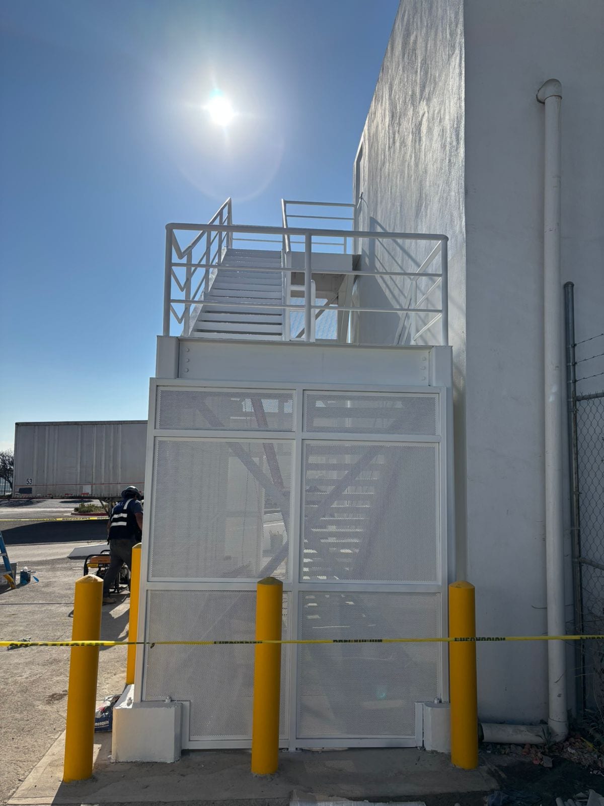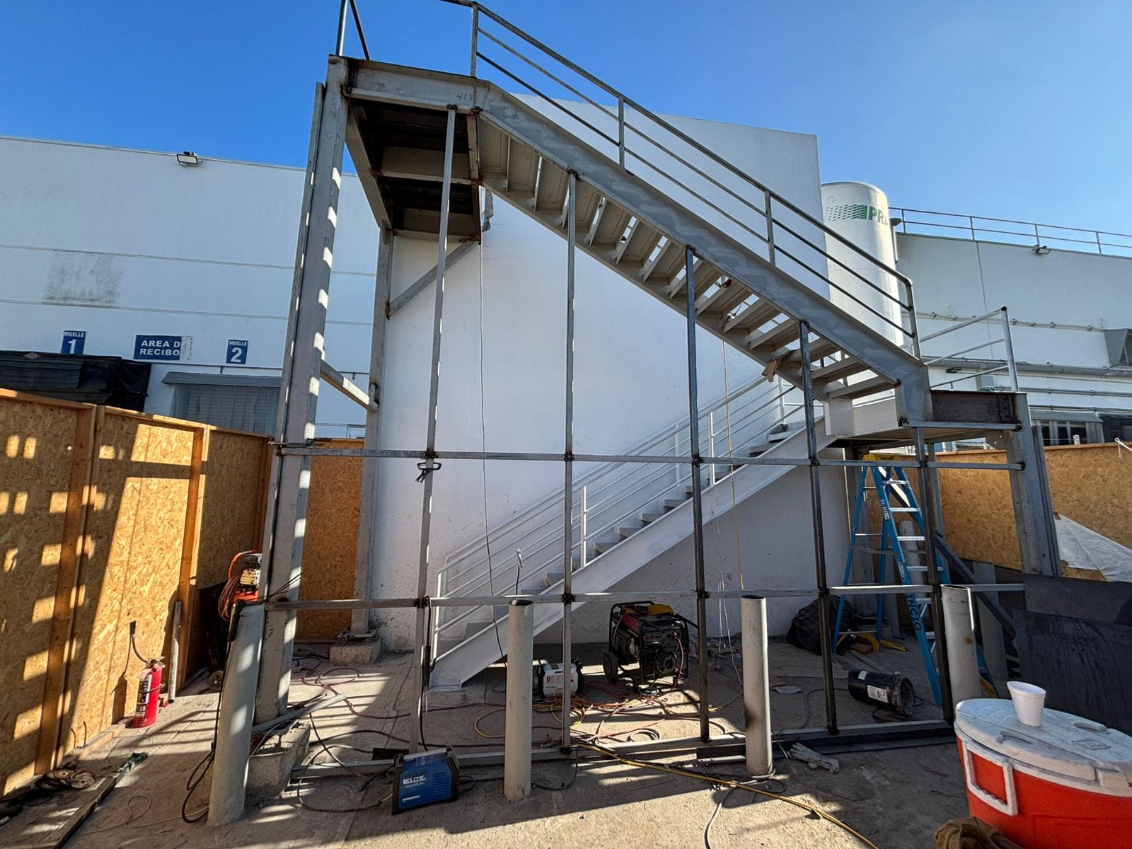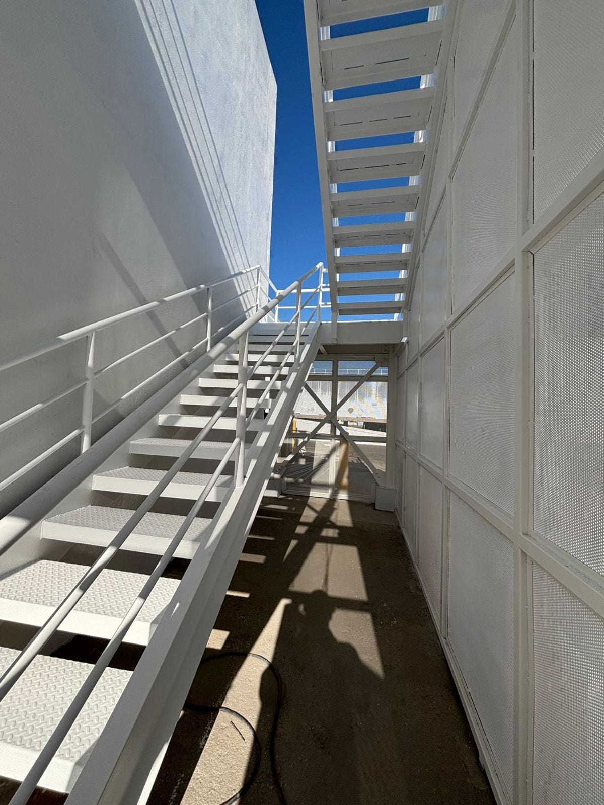 Anclaje y Montaje:Instalación de placas de base y fijación de la estructura principal. Se aseguró la nivelación y plomeo exacto de cada tramo y descanso.