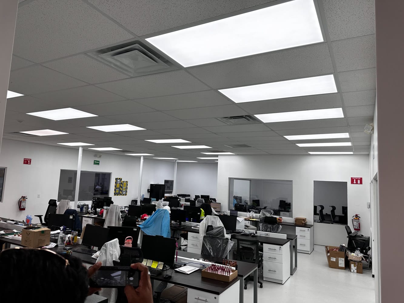 • Iluminación Eficiente: Implementamos un sistema de iluminación eficiente y bien distribuido, que no solo reduce el consumo energético, sino que también mejora la productividad y el bienestar del personal.